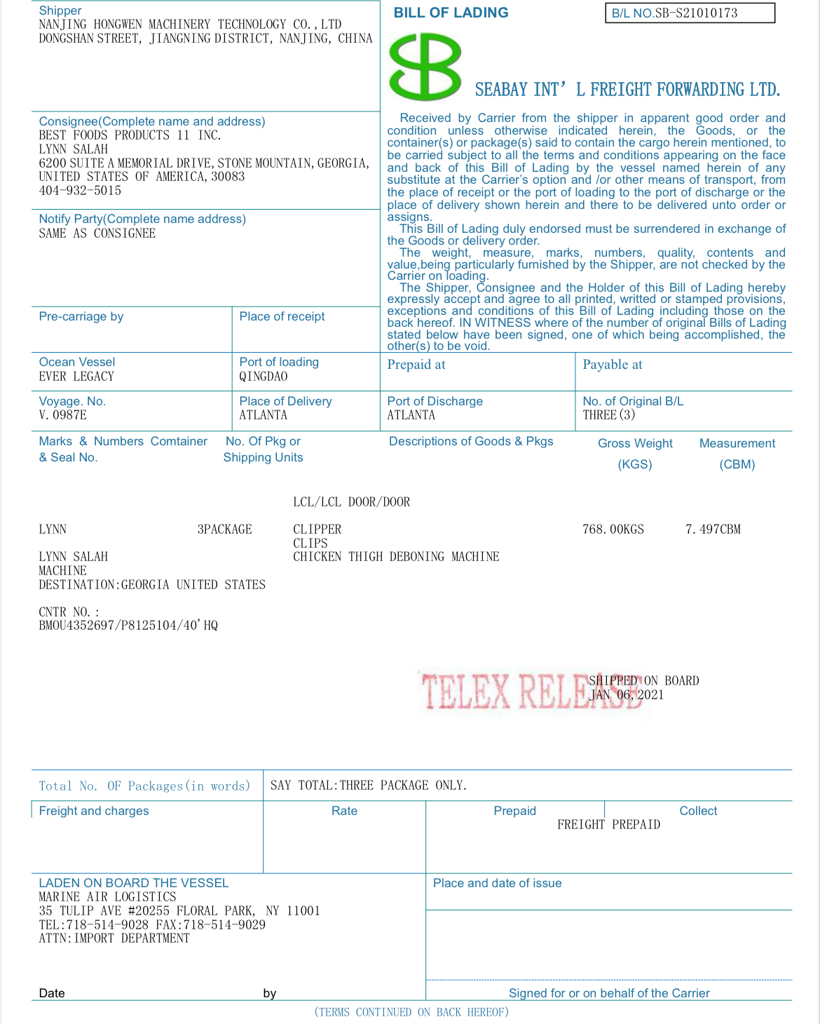U.S. customer ordered one set of full automatic chicken poultry leg thigh bone deboning removing deboner machine from Nanjing Hongwen Machinery Technology Co.,Ltd.2025-08-08